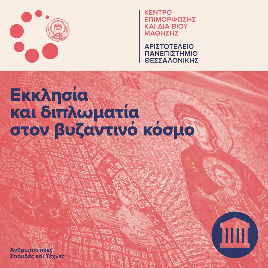Το Κέντρο Επιμόρφωσης και Διά Βίου Μάθησης (ΚΕΔΙΒΙΜ) του Αριστοτελείου Πανεπιστημίου Θεσσαλονίκης (Α.Π.Θ.) σας καλωσορίζει στο εκπαιδευτικό πρόγραμμα με τίτλο «Εκκλησία και διπλωματία στον βυζαντινό κόσμο», διάρκειας 41 διδακτικών ωρών), το οποίο θα διεξαχθεί το χειμερινό εξάμηνο του ακαδ. Έτους 2021 – 2022 με τη μέθοδο της εξ’ αποστάσεως εκπαίδευσης (σύγχρονη) μέσω της πλατφόρμας E-learning.auth.gr και του Zoom. Το Εκπαιδευτικό Πρόγραμμα θα πραγματοποιηθεί από το Τμήμα Βυζαντινής Θεολογίας του Κέντρου Βυζαντινών Ερευνών Α.Π.Θ.