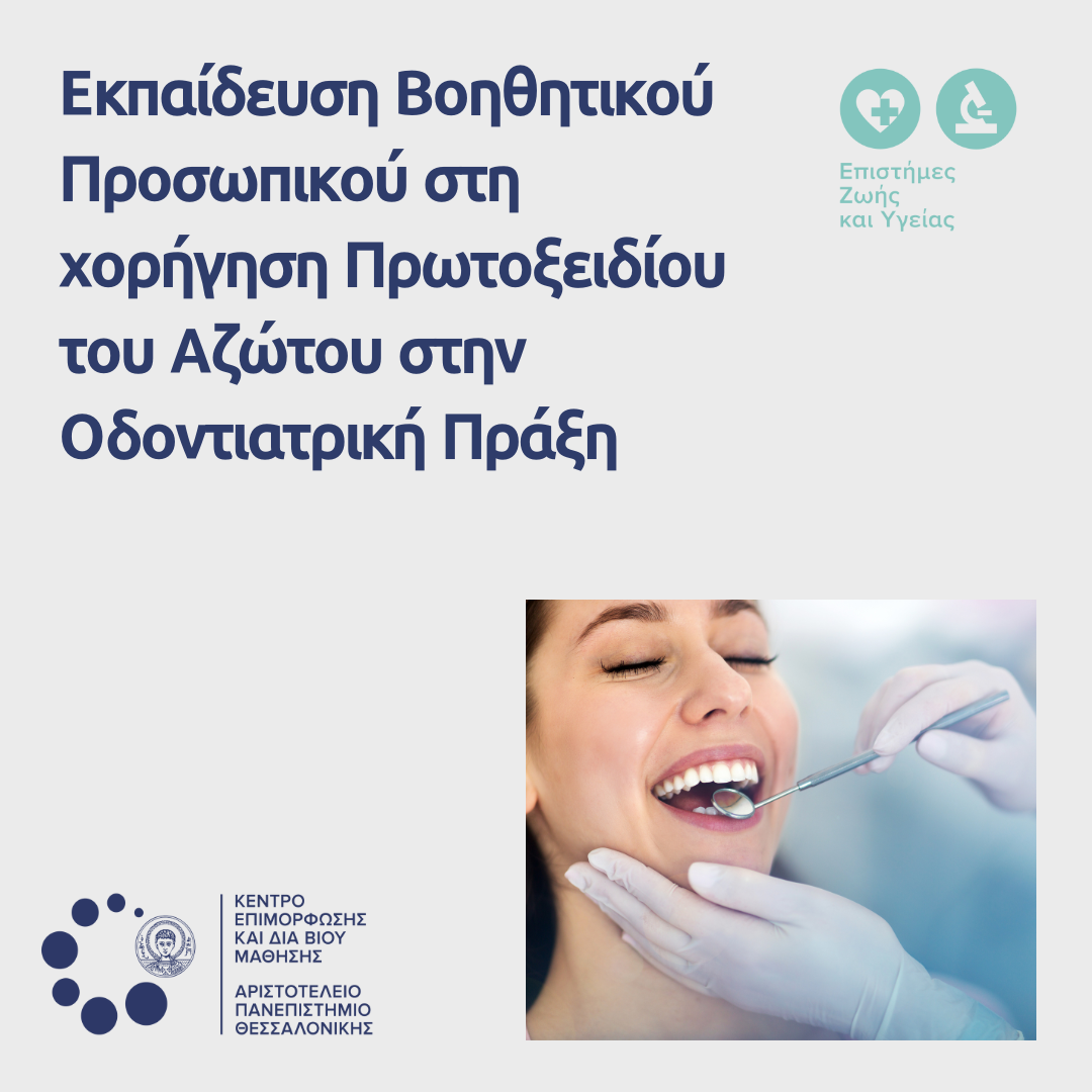Το Κέντρο Επιμόρφωσης και Διά Βίου Μάθησης (ΚΕΔΙΒΙΜ) του Αριστοτελείου Πανεπιστημίου Θεσσαλονίκης (ΑΠΘ) σας καλωσορίζει στο εκπαιδευτικό πρόγραμμαμε τίτλο Εκπαίδευση Βοηθητικού Προσωπικού στη χορήγηση Πρωτοξειδίου του Αζώτου στην Οδοντιατρική Πράξη, διάρκειας 16 διδακτικών ωρών, το οποίο θα διεξαχθεί το χειμερινό εξάμηνο του ακαδημαϊκού έτους 2025-26 (14/11/2025 -15/11/2025) και θα υλοποιηθεί δια ζώσης με φυσική παρουσία σε χώρο του ΑΠΘ. Το πρόγραμμα παρέχει 1 ECTS.
