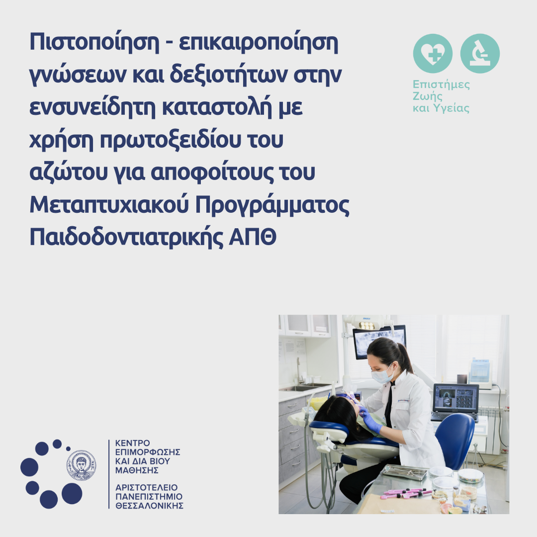 Το Κέντρο Επιμόρφωσης και Διά Βίου Μάθησης (ΚΕΔΙΒΙΜ) του Αριστοτελείου Πανεπιστημίου Θεσσαλονίκης (ΑΠΘ) σας καλωσορίζει στο εκπαιδευτικό πρόγραμμαμε τίτλο Πιστοποίηση – επικαιροποίηση γνώσεων και δεξιοτήτων στην ενσυνείδητη καταστολή με χρήση πρωτοξειδίου του αζώτου για αποφοίτους του Μεταπτυχιακού Προγράμματος Παιδοδοντιατρικής ΑΠΘ, διάρκειας 30 διδακτικών ωρών, το οποίο θα διεξαχθεί το χειμερινό εξάμηνο του ακαδημαϊκού έτους 2025-26 (14/11/2025 -16/11/2025) και θα υλοποιηθεί δια ζώσης με φυσική παρουσία σε χώρο του ΑΠΘ. Το πρόγραμμα παρέχει 3 ECTS.