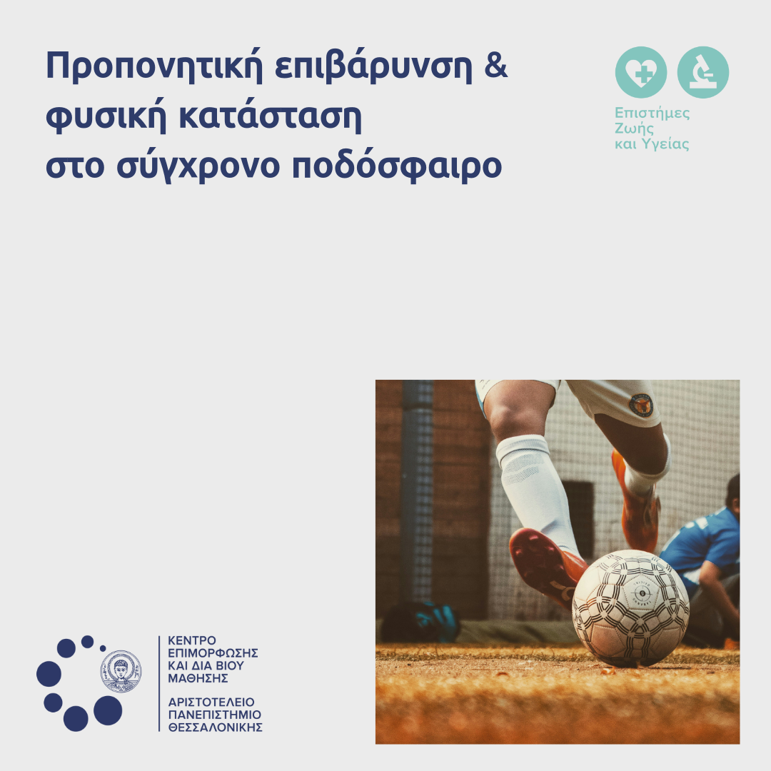 Το Κέντρο Επιμόρφωσης και Διά Βίου Μάθησης (ΚΕΔΙΒΙΜ) του Αριστοτελείου Πανεπιστημίου Θεσσαλονίκης (ΑΠΘ) σας καλωσορίζει στο εκπαιδευτικό πρόγραμμαμε τίτλο ‘’Προπονητική επιβάρυνση και φυσική κατάσταση στο σύγχρονο ποδόσφαιρο- Από την επιστήμη στην πράξη’’, διάρκειας 48 ωρών, το οποίο θα διεξαχθεί σε δυο τριήμερα 21-23/11/2025 και 5-7/12/2025 και θα υλοποιηθεί μεσύγχρονη εξ αποστάσεως εκπαίδευση, μέσω της πλατφόρμας ZoomMeeting. Το πρόγραμμα παρέχει 4,5 ECTS.