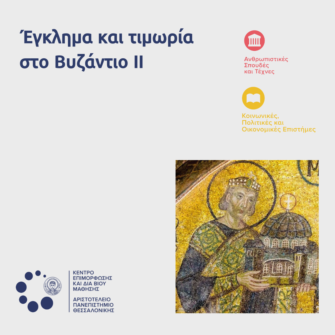 Το Κέντρο Επιμόρφωσης και Διά Βίου Μάθησης (ΚΕΔΙΒΙΜ) του Αριστοτελείου Πανεπιστημίου Θεσσαλονίκης (ΑΠΘ) σας καλωσορίζει στο εκπαιδευτικό πρόγραμμαμε τίτλο «Έγκλημα και Τιμωρία στο Βυζάντιο ΙΙ», διάρκειας 24 διδακτικών ωρών , το οποίο θα διεξαχθεί κατά το χειμερινό εξάμηνο 2025 – 26 (από τον Οκτώβριο 2025 έως τον Μάρτιο 2026) και θα υλοποιηθεί υβριδικά, δηλαδή τόσο με φυσική παρουσία, όσο και με σύγχρονη εξ αποστάσεως εκπαίδευση (με zoom). Το πρόγραμμα παρέχει 2 ECTS.