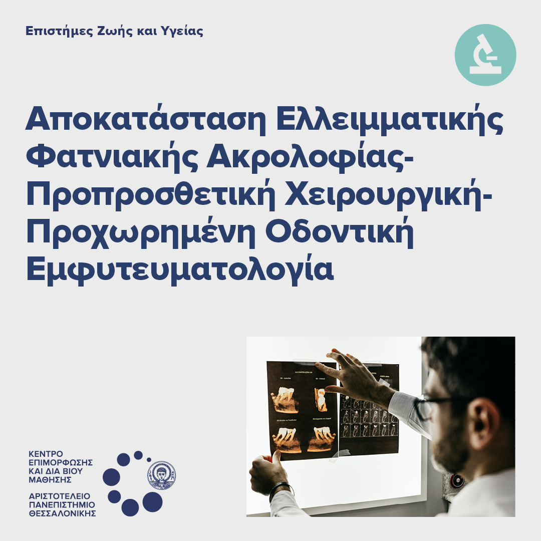 Το Κέντρο Επιμόρφωσης και Διά Βίου Μάθησης (ΚΕΔΙΒΙΜ) του Αριστοτελείου Πανεπιστημίου Θεσσαλονίκης (ΑΠΘ) σας καλωσορίζει στο Πρόγραμμα Δια Βίου Μάθησης με τίτλο «Αποκατάσταση Ελλειμματικής Φατνιακής Ακρολοφίας- Προπροσθετική Χειρουργική-Προχωρημένη Οδοντική Εμφυτευματολογία» (Residual Alveolar Ridge Reconstruction – Preprosthetic Oral Surgery – Advanced Dental Implantology – RE-PRO-IMPLANT),διάρκειας 94 διδακτικών ωρών, το οποίο θα διεξαχθεί στο εργαστήριο Στοματικής και Γναθοπροσωπικής Χειρουργικής του Τμήματος της Οδοντιατρικής τηςΣχολής Επιστημών Υγείας του Α.Π.Θ. και θα υλοποιηθεί με εκ του σύνεγγυς διδασκαλία και εκπαίδευση καθώς και με σύγχρονη εξ αποστάσεως εκπαίδευση.