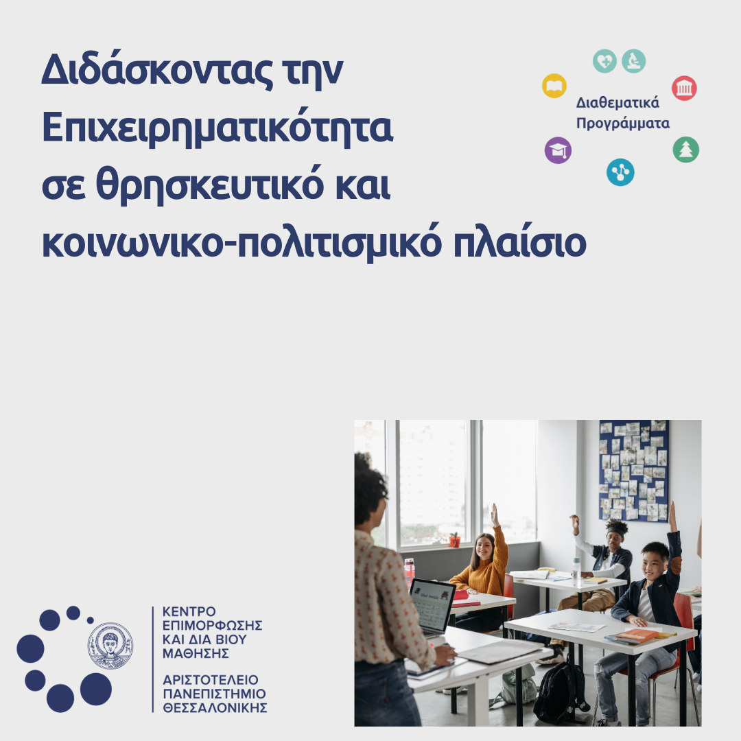 Το Κέντρο Επιμόρφωσης και Διά Βίου Μάθησης (ΚΕΔΙΒΙΜ) του Αριστοτελείου Πανεπιστημίου Θεσσαλονίκης (ΑΠΘ) σας καλωσορίζει στο εκπαιδευτικό πρόγραμμα με τίτλο «Διδάσκοντας την Επιχειρηματικότητα σε θρησκευτικό και κοινωνικο-πολιτισμικό πλαίσιο».