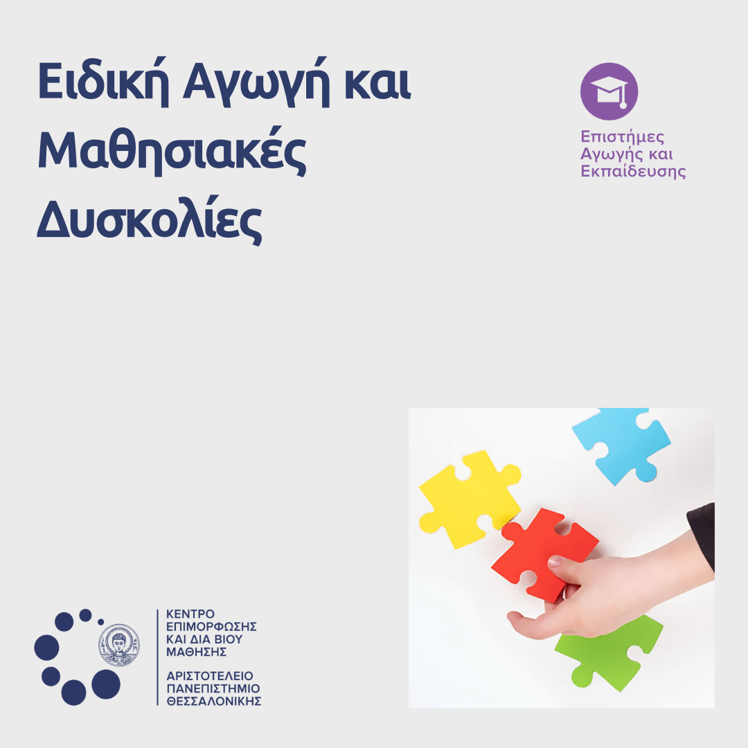 Το Κέντρο Επιμόρφωσης και Διά Βίου Μάθησης (ΚΕΔΙΒΙΜ) του Αριστοτελείου Πανεπιστημίου Θεσσαλονίκης (ΑΠΘ) σας καλωσορίζει στο εκπαιδευτικό πρόγραμμα με τίτλο «Ειδική Αγωγή και Μαθησιακές Δυσκολίες», διάρκειας 450 διδακτικών ωρών, το οποίο θα διεξαχθεί και θα υλοποιηθεί με τη μέθοδο ασύγχρονη εξ αποστάσεως εκπαίδευση. Επιστημονική Υπεύθυνη του προγράμματος είναι η Σουζάνα Παντελιάδου.