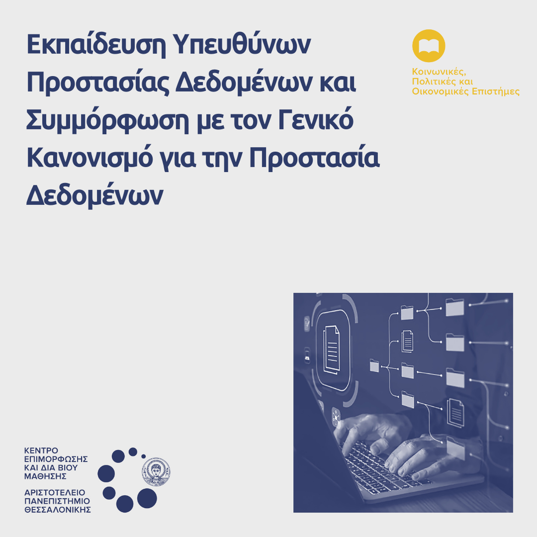 Το Κέντρο Επιμόρφωσης και Διά Βίου Μάθησης (ΚΕΔΙΒΙΜ) του Αριστοτελείου Πανεπιστημίου Θεσσαλονίκης (ΑΠΘ) σας καλωσορίζει στο εκπαιδευτικό πρόγραμμαμε τίτλο «Εκπαίδευση Υπευθύνων Προστασίας Δεδομένων και Συμμόρφωση με τον Γενικό Κανονισμό για την Προστασία Δεδομένων», διάρκειας 50 διδακτικών ωρών, το οποίο θα διεξαχθεί από απόσταση και θα υλοποιηθείμέσω της πλατφόρμας vconf.auth.gr.
