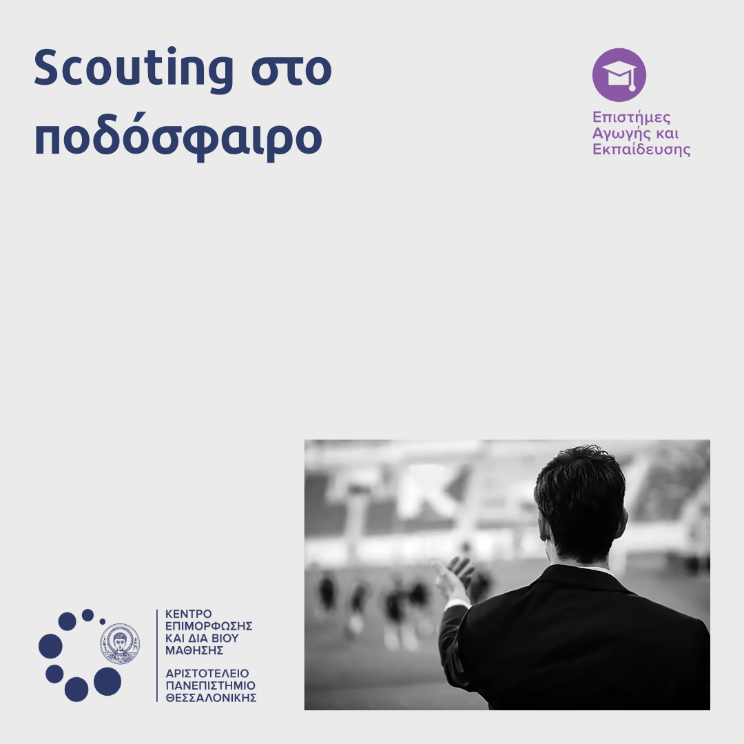 Το Κέντρο Επιμόρφωσης και Διά Βίου Μάθησης (ΚΕΔΙΒΙΜ) του Αριστοτελείου Πανεπιστημίου Θεσσαλονίκης (ΑΠΘ) σας καλωσορίζει στο εκπαιδευτικό πρόγραμμαμε τίτλο Scouting στο ποδόσφαιρο (6ος κύκλος), διάρκειας 80 διδακτικών ωρών, το οποίο θα διεξαχθεί από 15 Μαΐου 2026 έως και 14 Ιουνίου 2026 και θα υλοποιηθεί μεσύγχρονη εξ αποστάσεως εκπαίδευση, μέσω της πλατφόρμας ZoomMeeting και ασύγχρονη διδασκαλία. Το πρόγραμμα παρέχει 6,5 ECTS.
