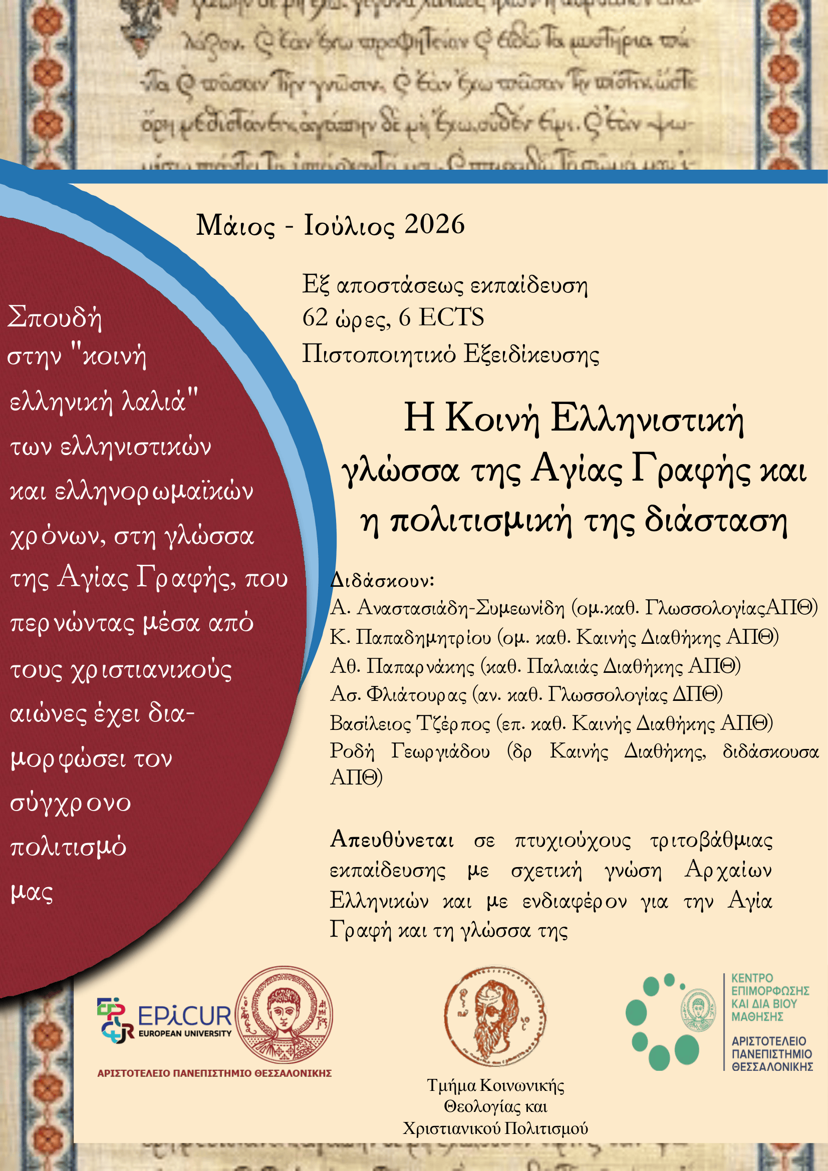 Το Κέντρο Επιμόρφωσης και Διά Βίου Μάθησης (ΚΕΔΙΒΙΜ) του Αριστοτελείου Πανεπιστημίου Θεσσαλονίκης (ΑΠΘ) σας καλωσορίζει στο εκπαιδευτικό πρόγραμμα με τίτλο «Η Κοινή Ελληνιστική γλώσσα της Αγίας Γραφής και η πολιτισμική της διάσταση», διάρκειας 62 διδακτικών ωρών, το οποίο θα διεξαχθεί από τον Μάιο ως τον Ιούλιο 2026 και θα υλοποιηθεί με τη μέθοδο της εξ αποστάσεως σύγχρονης εκπαίδευσης με χρήση της πλατφόρμας elearning.auth.gr, μέσω της πλατφόρμας zoom.
